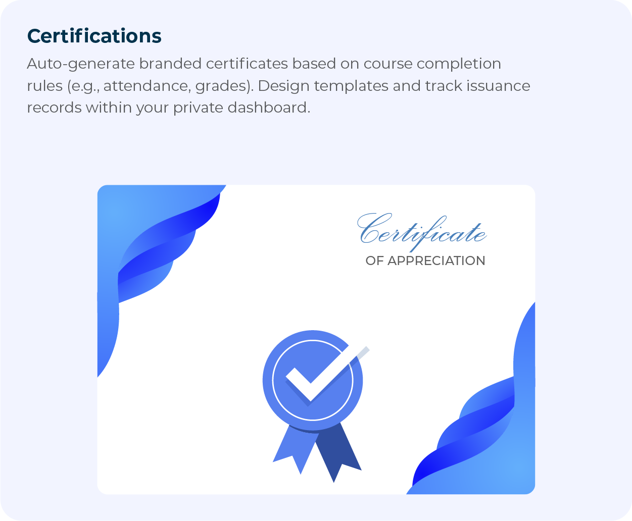 Attendance is tracked, certificates issued, reminders sent, reports generated—without switching systems.